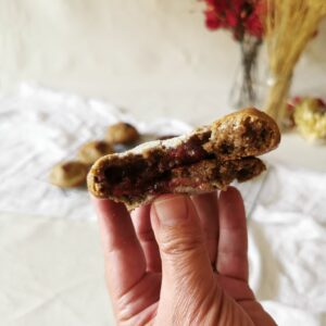 A aparência rústica e natural não é por acaso — ela revela o cuidado no preparo e antecipa a experiência de um cookie genuinamente caseiro, com qualidade de confeitaria.