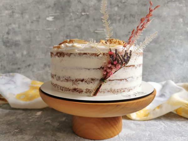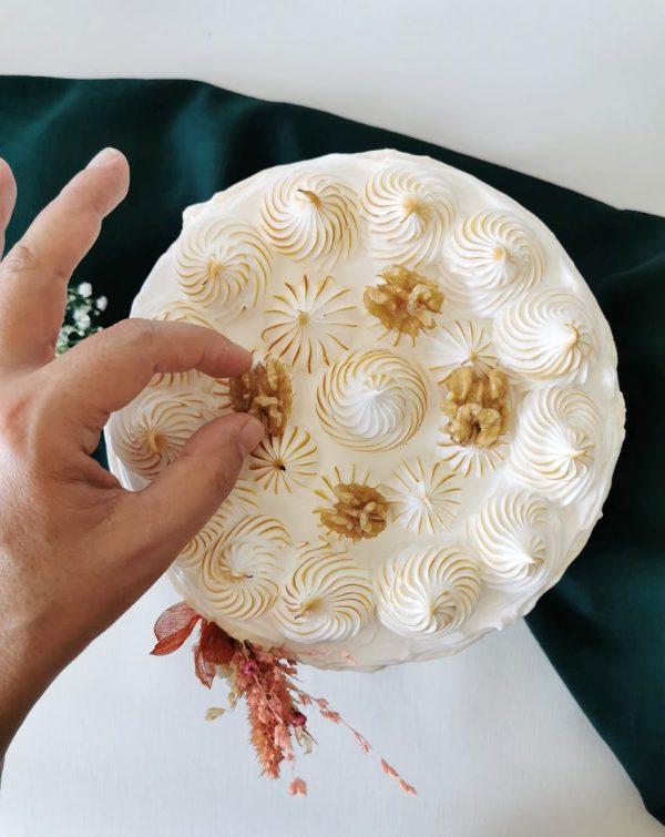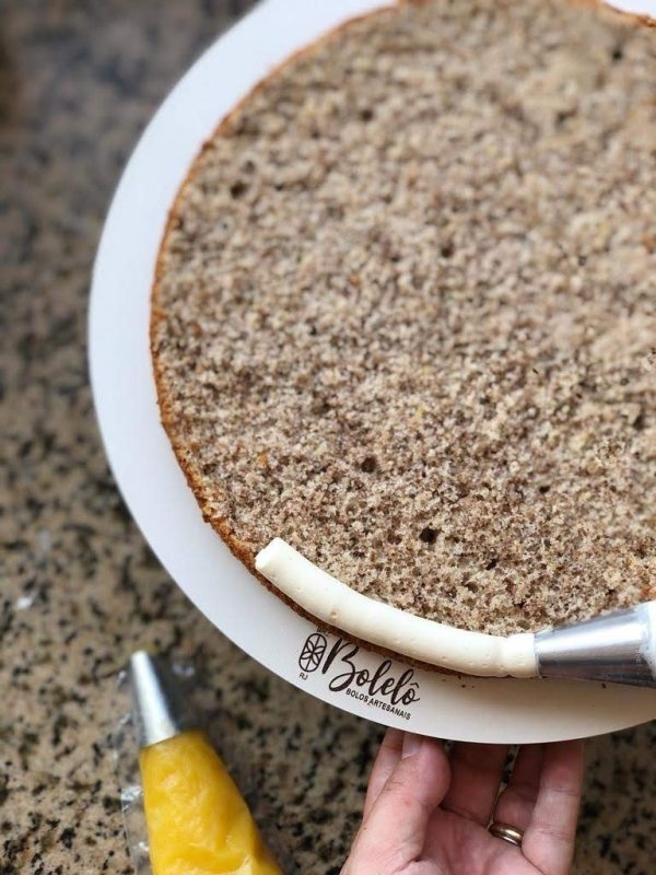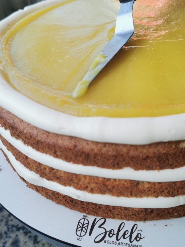Massa de nozes, com suave toque de limão siciliano, recheio de geleia artesanal de damasco OU Baba de moça e doce de leite cozido, contenção dos recheios em buttercream e cobertura de merengue.