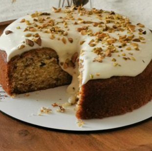 Um bolo aromático, saboroso e surpreendente. A mistura do pistache com limão siciliano fica suave e a cobertura cremosa com um toque de mel e o crocante do pistache triturado, traz um sabor muito elegante e refinado!