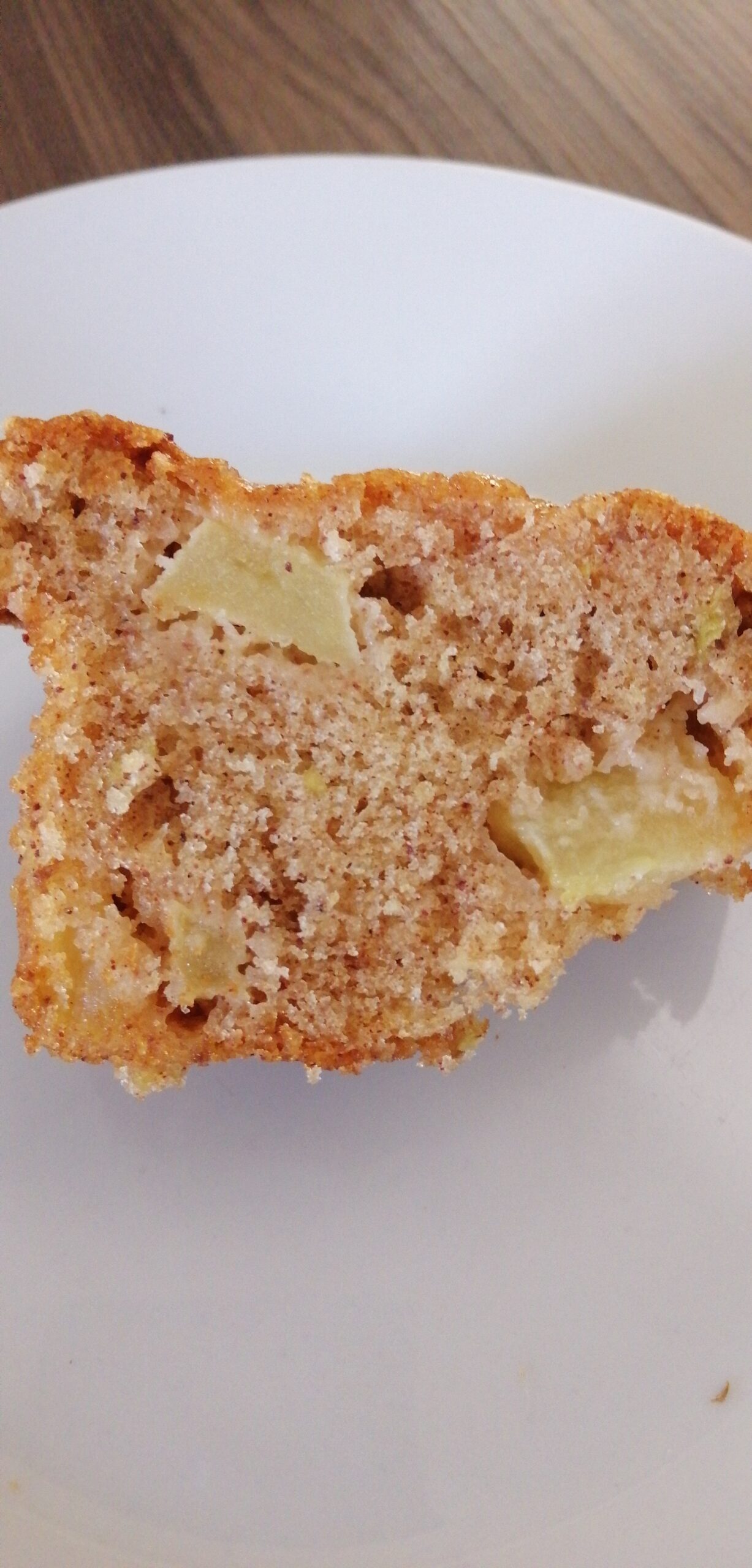 Pedaços que você vê e sente: Isso não é um bolo com “essência de maçã”. É um bolo com pedaços da fruta salpicados por dentro. Ao morder, você encontra o contraste perfeito: a massa úmida e fofinha se desmancha, e você dá de cara com um pedaço de maçã levemente crocante.